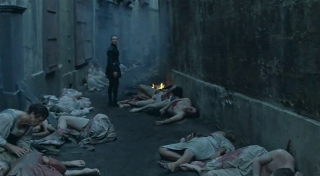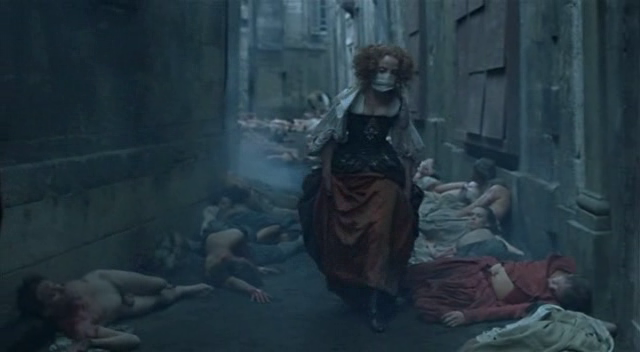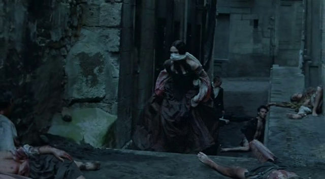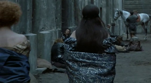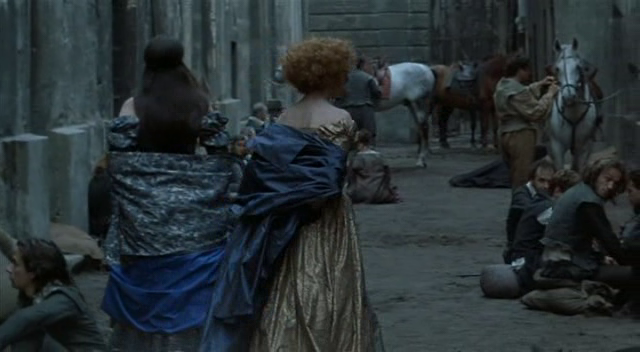 Sur ce plan, on la voit de dos accompagnée d’Henriette de Nevers (Dominique Blanc). Les murs sombres, les gens affalés à même le sol boueux, montrent bien que nous sommes dans un quartier mal famé de la capitale…