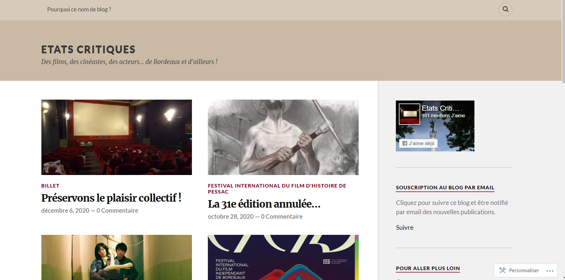 C’est pour cela que j’ai décidé, en 2016, de donner une couleur plus locale au blog en l’axant vraiment sur la couverture des festivals de cinéma sur Bordeaux et à proximité (FIFIB, Festival du Film d’Histoire de Pessac).