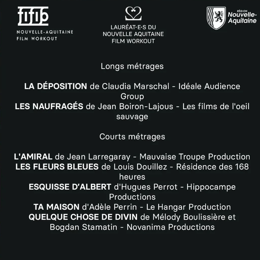 - Lauréats du Nouvelle-Aquitaine Film Workout : Concours organisé en partenariat avec la région Nouvelle-Aquitaine, à destination de courts et de longs métrages en tournage ou en début de post production.