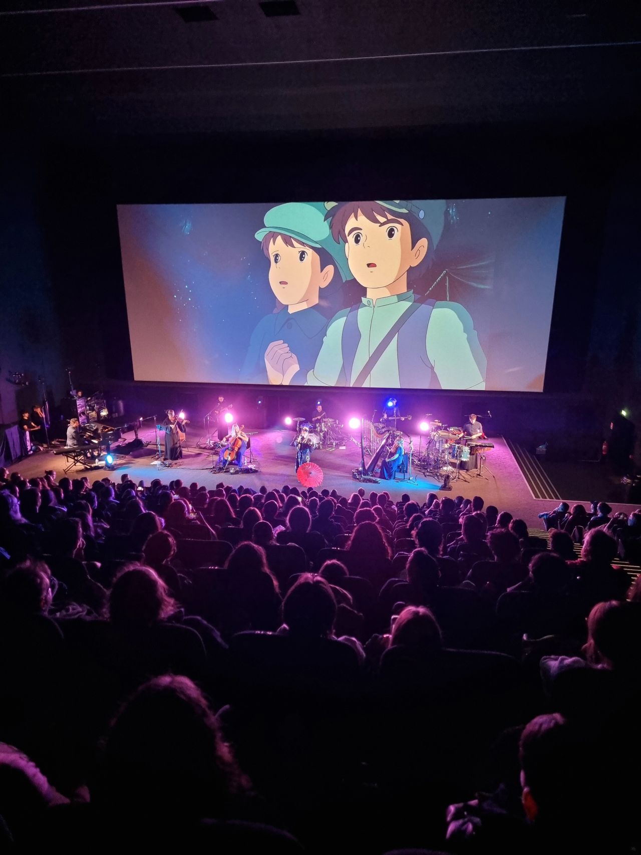 En effet, le groupe n’hésitait pas à inciter le public à participer aux chansons, il y avait un vrai échange avec les gens, et chaque moment musical a été présenté par Nicolas Chaccour (pianiste et fondateur du groupe), qui en a profité pour questionner les spectateurs et spectatrices sur leur film préféré de Miyazaki, ou encore nous raconter une belle histoire : en 2014, une jeune harpiste bordelaise a assisté à un concert du Neko Light Ochestra à Talence dans le cinéma Gaumont d’alors…