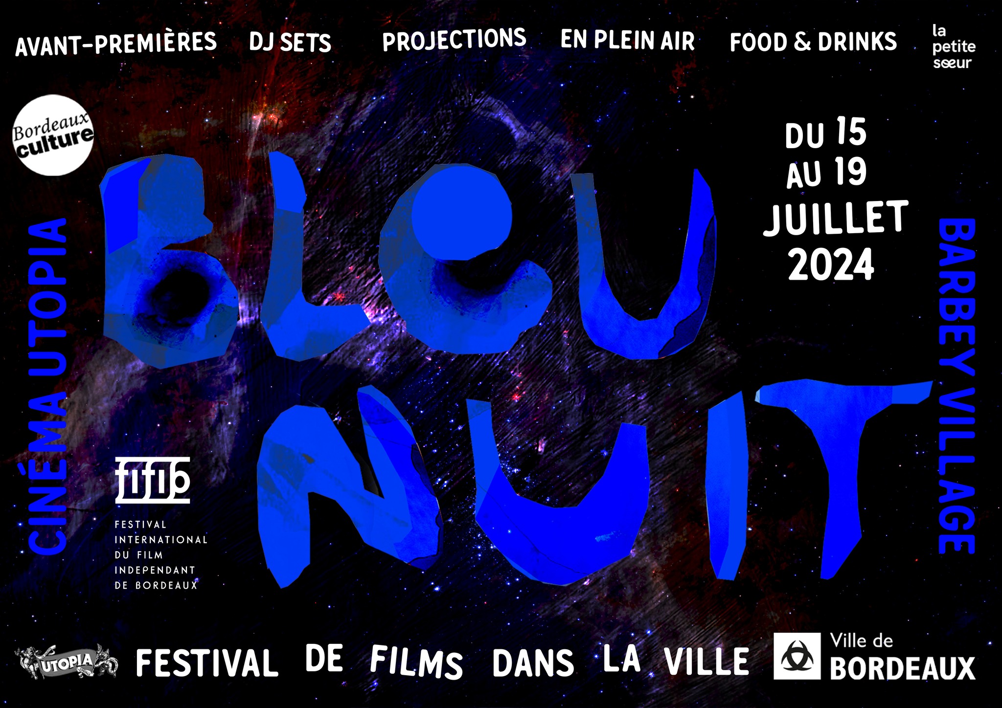 Du 15 au 19 juillet, le Festival International du Film Indépendant de Bordeaux prend ses quartiers d’été avec la 3e édition de Bleu Nuit, son festival d’été, qui propose une sélection d’avant-premières tous les soirs sous la nef du cinéma Utopia, puis des concerts de DJ, des apéritifs et même, des projections sous les étoiles dans la cour de Barbey Village !