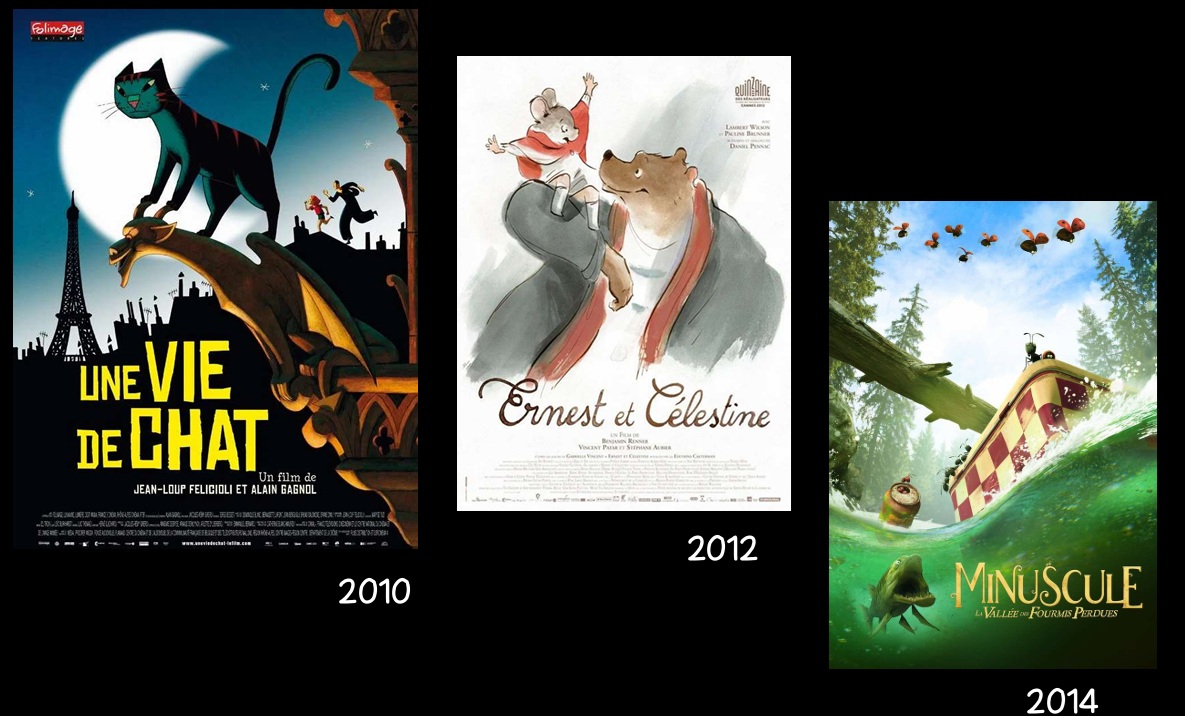 Plusieurs films d’animation français ont marqué les esprits ces dernières années, on peut mettre en avant : Une vie de chat (2010) d’Alain Gagnol et Jean-Loup Felicioli, Ernest et Célestine (2012), Minuscules – la vallée des fourmis perdues (2013) d’Hélène Giraud et Thomas Szabo (film qui mélange prises de vues réelles et animation).