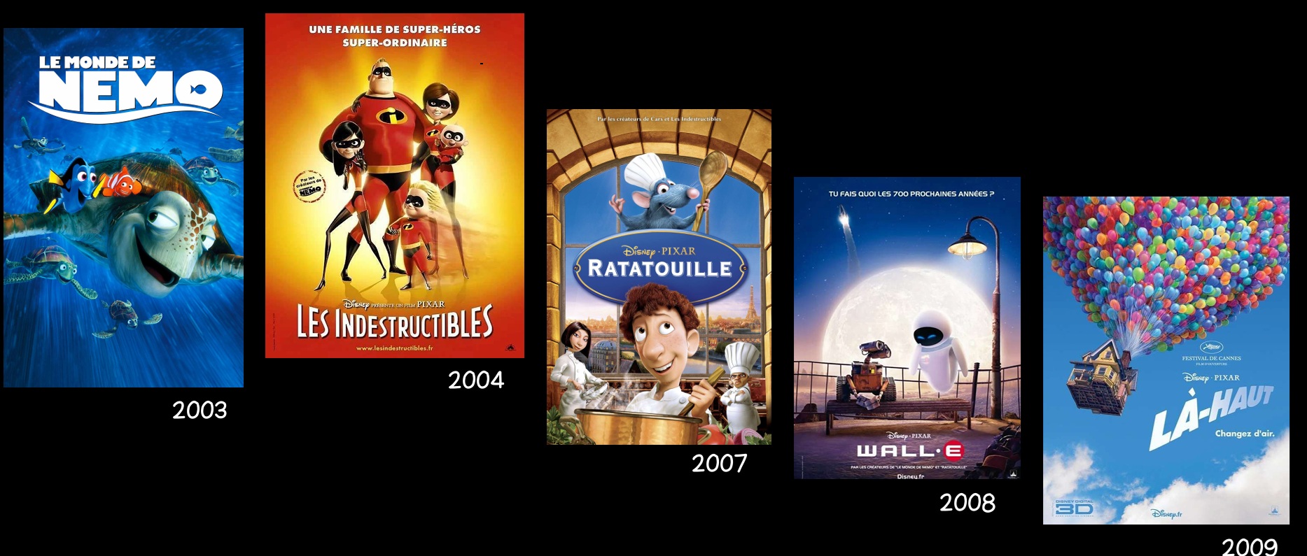 Les succès s’enchaînent, à un rythme impressionnant : Le Monde de Nemo (2003) (un film vraiment magnifique, le rendu de l’eau est très beau), Les Indestructibles (2004) (un super film de super-héros pour petits et grands, très réussi), Ratatouille (2007), Wall-E (2008) (un drôle de film avec une première heure sans dialogue, tout passe par l’image… assez incroyable !) et enfin Là-haut (2009) (très beau même s’il commence mal. On y suit Carl, un retraité veuf, qui fixe des ballons à sa maison pour s’envoler vers l’Amérique du Sud. Un film incroyable, très touchant pour toutes les générations).