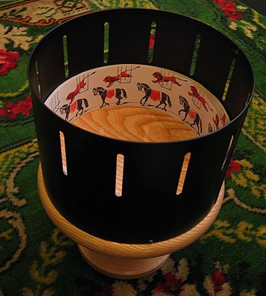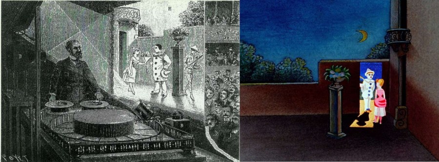 Il s’agit d’un dispositif assez complexe (constitué de manivelles, de miroirs…) qui reprend le principe des jouets optiques (en faisant défiler des images) mais en y ajoutant un système de projection de lumières.